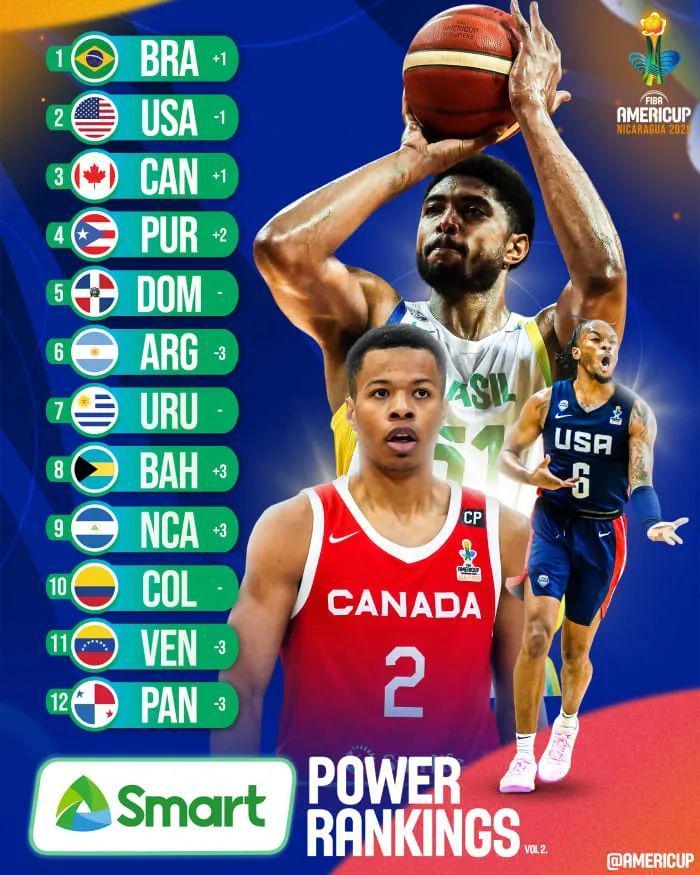 美国爆冷之前最新一期美洲杯官方实力榜,巴西男篮升至第一,美国男篮降至第二,乌拉圭是第7